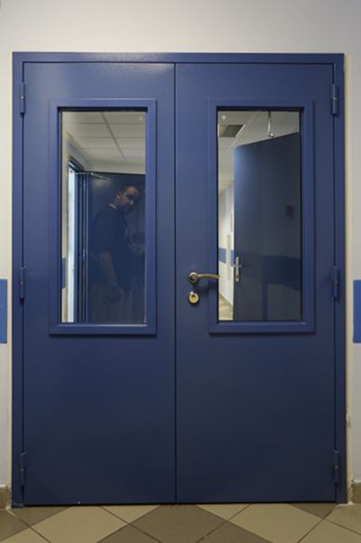 Противопожарная алюминиевая дверь синего цвета в Сергиев посаде