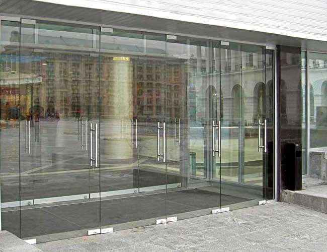 Противопожарная безрамная дверь со стеклом в торговый центр в Сергиев посаде